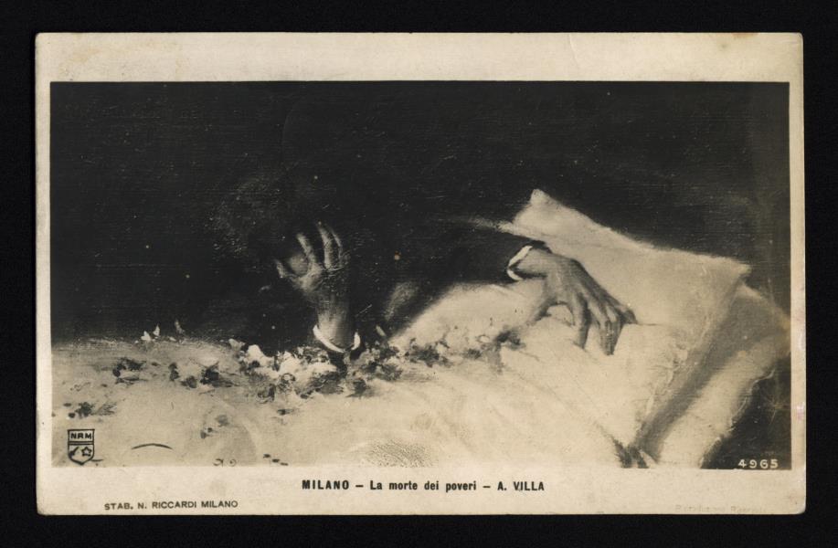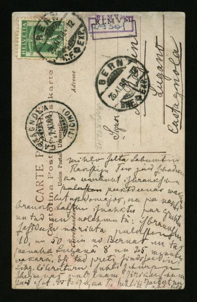 Ilustrēta atklātne ar melnbaltu gleznas reprodukciju (RTMM 29301). Uzraksts: „MILANO — La morte del poveri. — A. VILLA.” Teksts rakstīts ar melnu tinti. Atklātne adresēta: „Signor A. Naglin, Lugano, Castagnola.” Pasta zīmogi: „Bern 26.XI.08.; Castagnola 27.XI.08.” Pirmpublicējums. Nosūtīšanas vieta un datējums noteikts pēc pasta zīmoga.