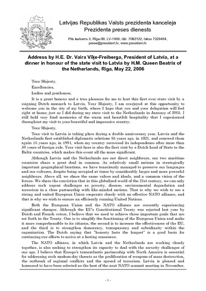 Address by H.E. Dr. Vaira Vīķe-Freiberga, President of Latvia, at a dinner in honour of the state visit to Latvia by H.M. Queen Beatrix of the Netherlands, Riga, May 22, 2006