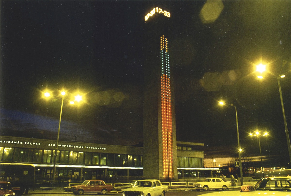Rīgas Centrālās dzelzceļa stacijas pulksteņa tornis ar daudzprogrammu sinhronu gaismas sistēmu. Rīga, Latvija