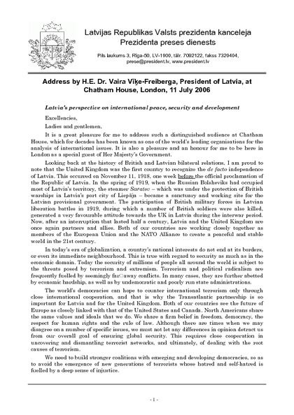 Address by H.E. Dr. Vaira Vīķe-Freiberga, President of Latvia, at Chatham House, London, 11 July 2006