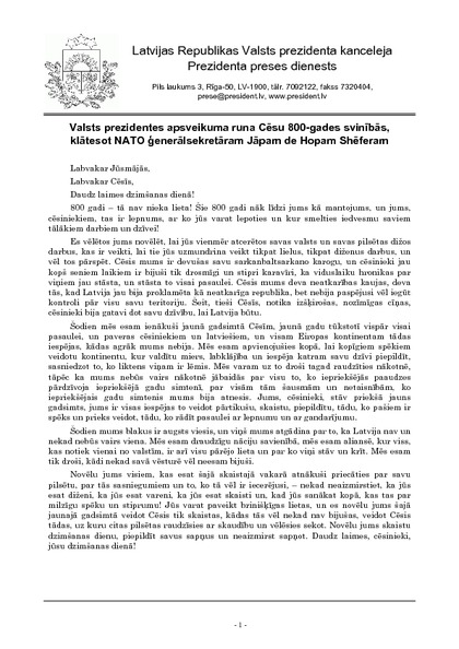 Valsts prezidentes apsveikuma runa Cēsu 800-gades svinībās, klātesot NATO ģenerālsekretāram Jāpam de Hopam Shēferam