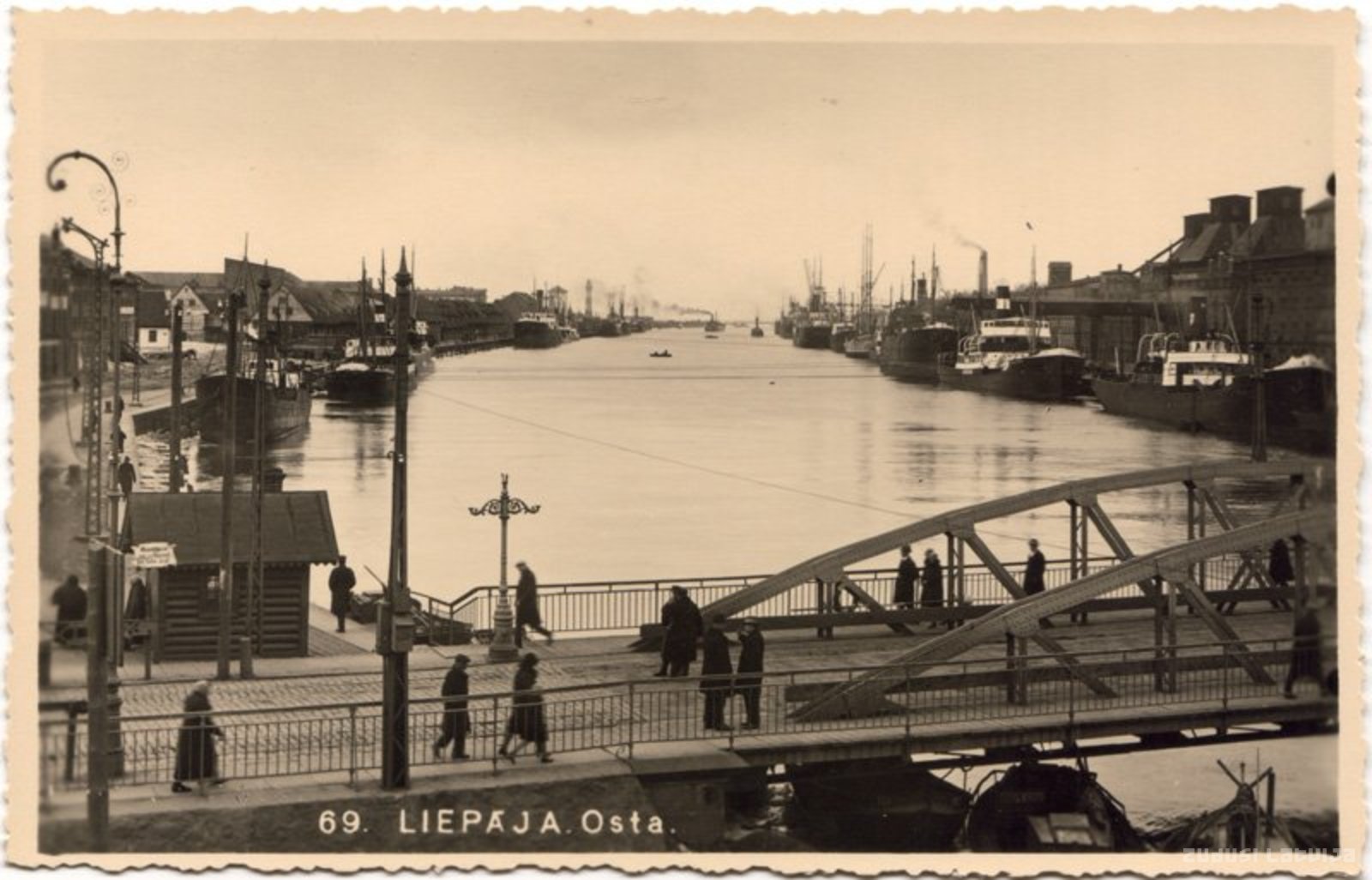 Liepājas osta 20. gadsimta 30. gados. Osta laikā no 1890. līdz 1897. gadam tika izbūvēta par vienu no labākajām un lielākajām Krievijas impērijas ostām un bija trešā nozīmīgākā osta Baltijā tūlīt aiz Pēterburgas un Rīgas. Kopš 1906. gada uzturēja kuģu satiksmi arī ar Ņujorku, vēlāk arī ar Halifaksu, taču kara dēļ nepaspēja realizēt kuģu satiksmes atklāšanu ar Dienvidameriku. Priekšplānā tilts pār Tirdzniecības kanālu, kas savieno Liepājas ezeru ar jūru, kura krastos redzama ostmalas apbūve - noliktavas ar sarkanu dakstiņu jumtiem. Tiltu, kuram bija Beļģijā izgatavots griešanas mehānisms, atklāja un iesvētīja 1881. gadā. Tas savienoja Vecliepājas Lielo ielu ar Jaunliepājas Brīvības ielu un pastāvēja līdz pat 20. gadsimta 50. gadiem; kopš 1899. gada pa to kursēja elektriskais tramvajs. Kopš 1961. gada tā vietā atrodas jauns tilts. Ostmalas apbūve gāja bojā Otrā pasaules kara laikā. Pašlaik notiek Vecās Ostmalas labiekārtošana un rekonstrukcija.