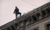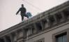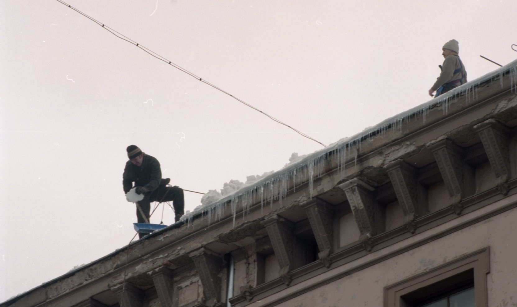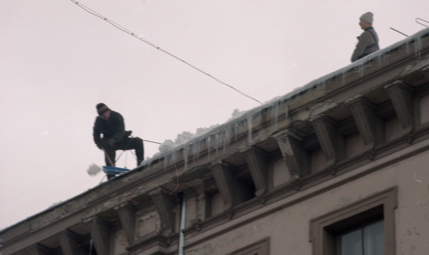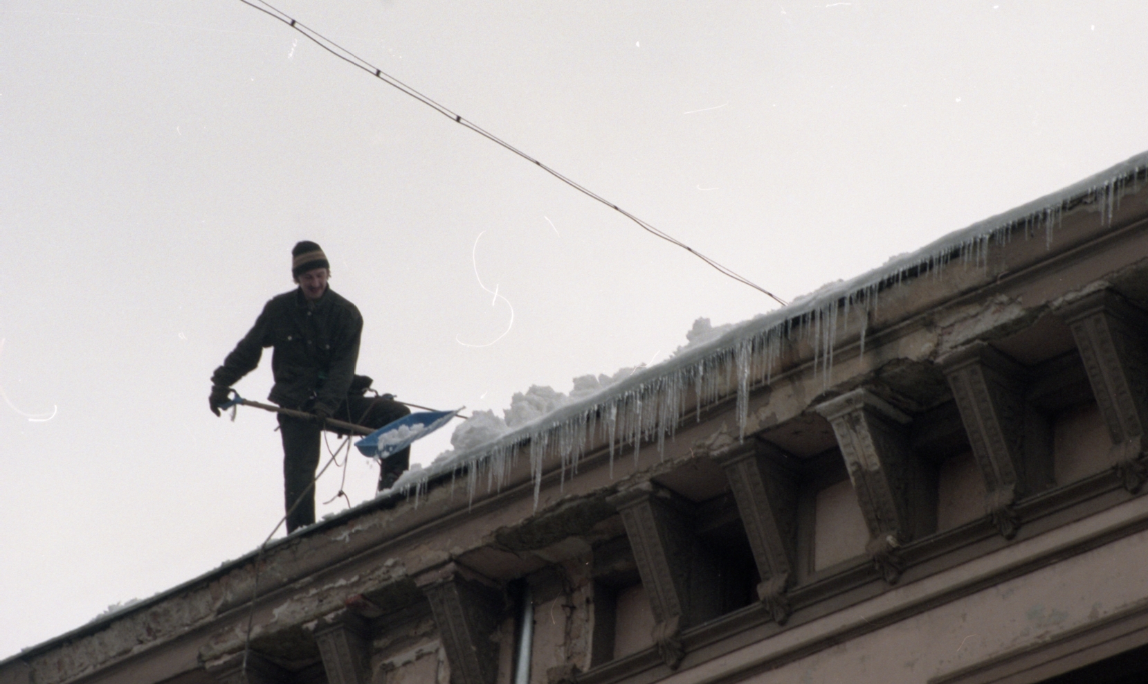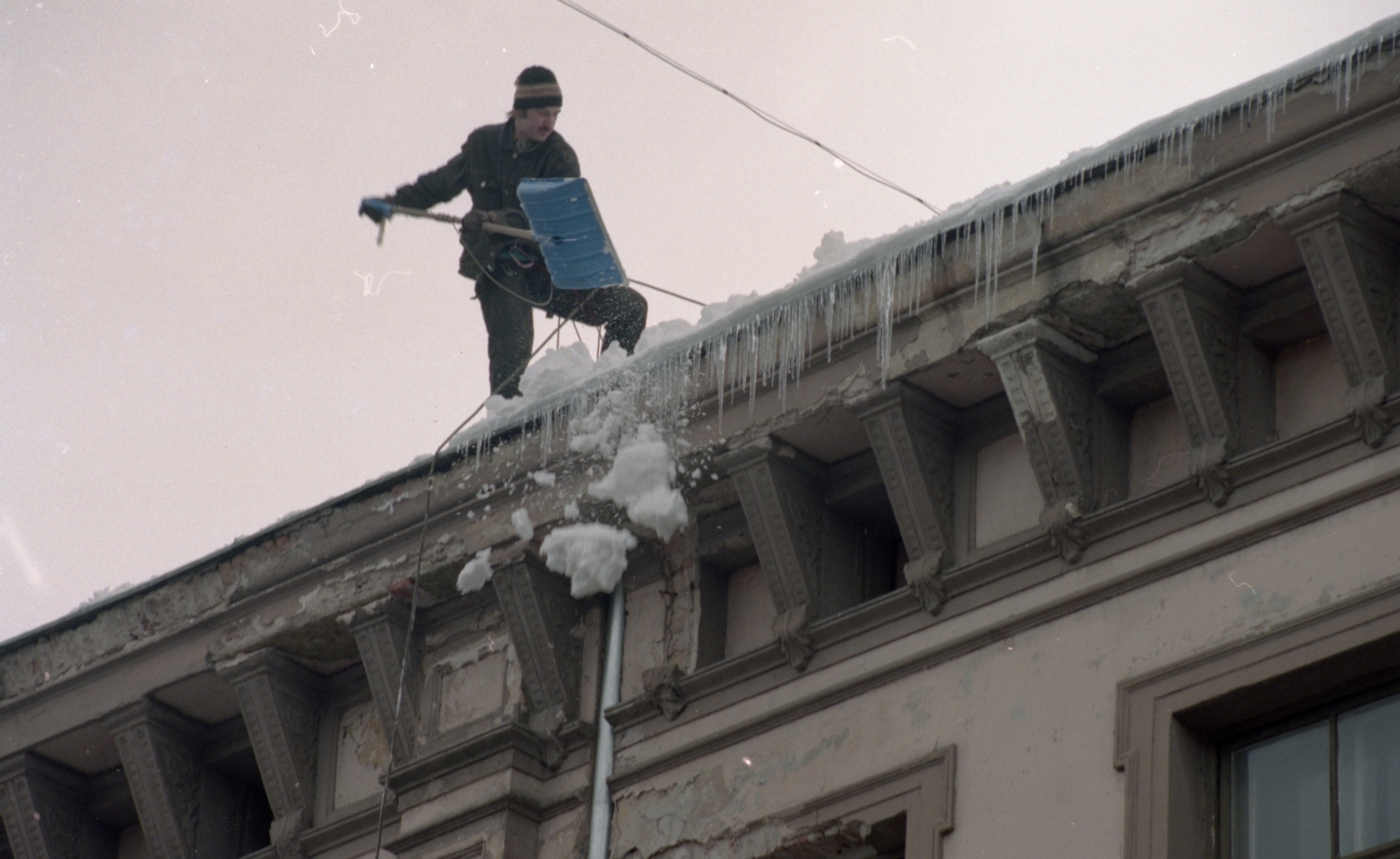Sniega tīŗišana no jumta. Švarca muižiņa. Arhīva darbiniece