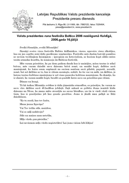 Valsts prezidentes runa festivāla Baltica 2006 noslēgumā Kuldīgā, 2006.gada 16.jūlijā