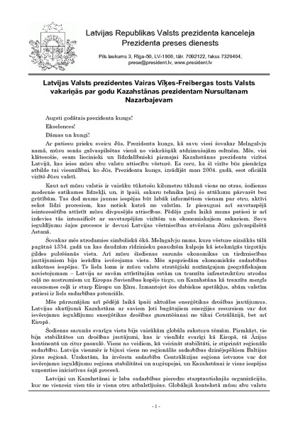 Latvijas Valsts prezidentes Vairas Vīķes-Freibergas tosts Valsts vakariņās par godu Kazahstānas prezidentam Nursultanam Nazarbajevam