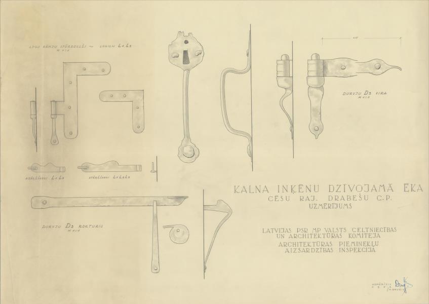 Kalna Inķēnu dzīvojamā ēka. Logu, durvju detaļas – durvju rokturis, durvju vira, logu rāmju stūrdzelži (Amatas novads, Drabešu pagasts. Kalna Inķēni.)