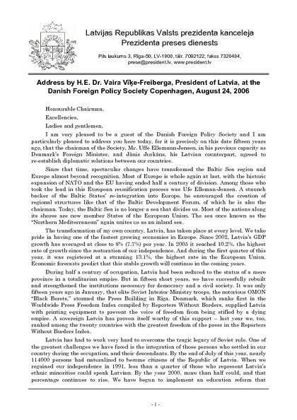 Address by H.E. Dr. Vaira Vīķe-Freiberga, President of Latvia, at the Danish Foreign Policy Society Copenhagen, August 24, 2006