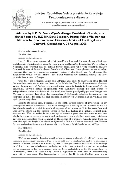 Address by H.E. Dr. Vaira Vīķe-Freiberga, President of Latvia, at a dinner hosted by H.E. Mr. Bent Bendsen, Deputy Prime Minister and Minister for Economics and Business Affairs of the Kingdom of Denmark, Copenhagen, 24 August 2006