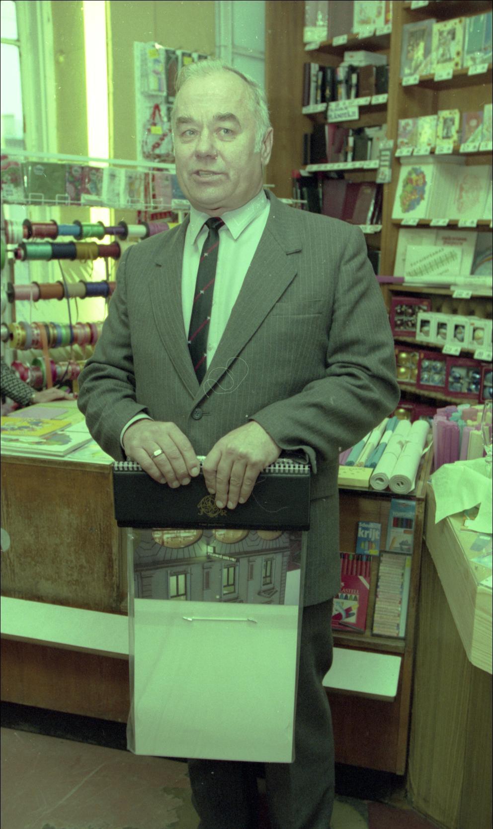 Jāņa Rozes grāmatnīca. Andris Bērziņš - Latvijas bērnu fonds. Andrejs Gecs - Līgatnes papīrfabrikas komercdirektors. Ināra Beļinkaja - firmas Jānis Roze direktore. Vējš universālveikalā. - Puriņš, Raitis, 1958- - 1996-12-10 (Fotogrāfija)