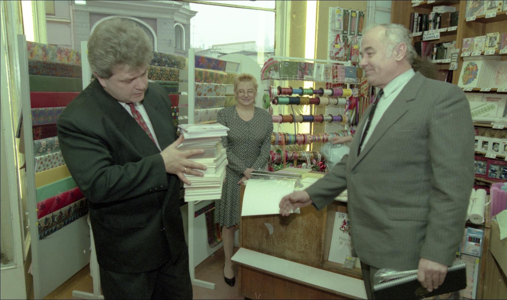 Jāņa Rozes grāmatnīca. Andris Bērziņš - Latvijas bērnu fonds. Andrejs Gecs - Līgatnes papīrfabrikas komercdirektors. Ināra Beļinkaja - firmas Jānis Roze direktore. Vējš universālveikalā. - Puriņš, Raitis, 1958- - 1996-12-10 (Fotogrāfija)