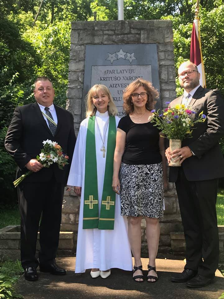 Piemiņas brīdis Indianapoles Latviešu sabiedriskajā centrā pie Kritušo varoņu, aizvesto un mocekļu pieminekļa. No kreisās: Latvijas goda konsuls Indianas štatā Andris Bērziņš, mācītāja Dace Zusmane, Indianapoles Daugavas vanagu priekšniece Nora Ceriņa, Indianapoles Latviešu luterāņu draudzes priekšsēdis Andrejs Kancs. Indianapole, Amerikas Savienotās Valstis