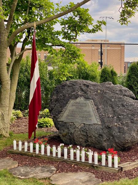 Piemiņas brīdis Indianapoles Latviešu sabiedriskajā centrā pie Kritušo varoņu, aizvesto un mocekļu pieminekļa. Indianapole, Amerikas Savienotās Valstis