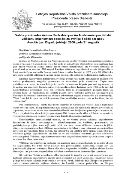 Valsts prezidentes uzruna Centrāleiropas un Austrumeiropas valstu vēlēšanu organizatoru asociācijas svinīgajā sēdē par godu Asociācijas 15 gadu jubilejai 2006.gada 31.augustā