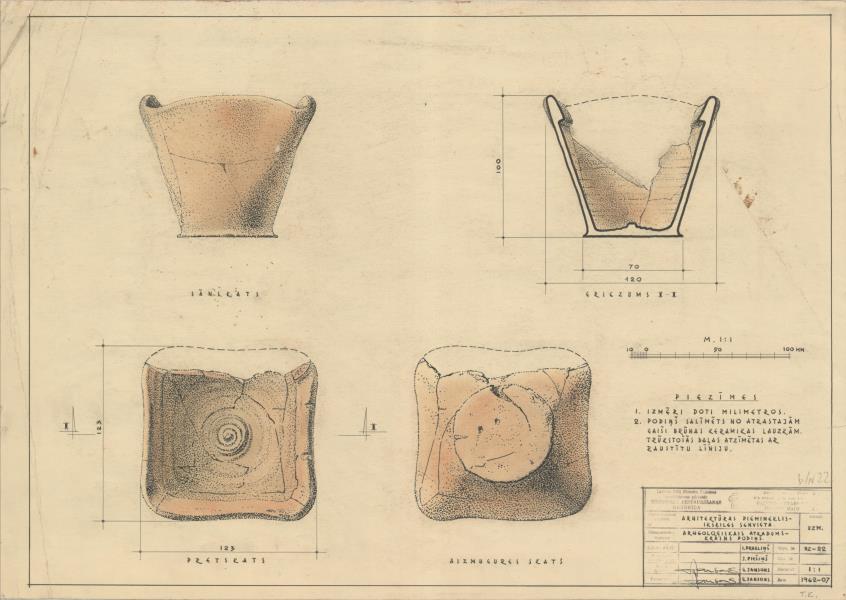 Ikšķiles baznīcas drupas. Arheoloģijas atradumi, krāsns podiņš (Ikšķiles novads, Tīnūžu pagasts.)