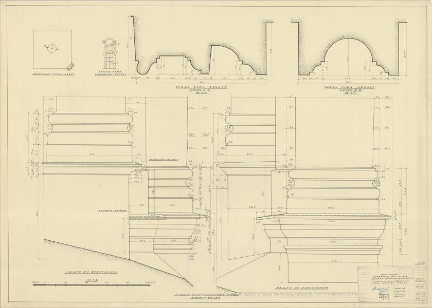 Academia Petrina. Torņa dienvidrietumu stūra kolonnu bāzes, loga apmales ( Jelgava. Akadēmijas iela 10.)