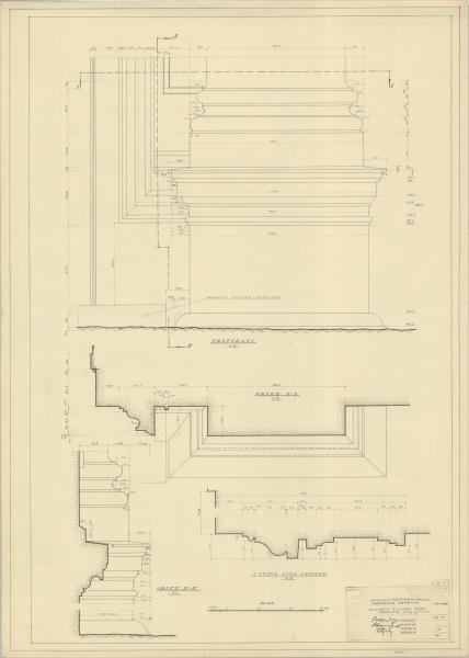 Academia Petrina. Pagalma centrālā pilastra bāze, pirmā stāva loga apmale ( Jelgava. Akadēmijas iela 10.)