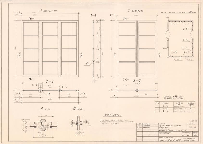 Ārskati, logu izvietojuma shēma, rāmju specifikācija