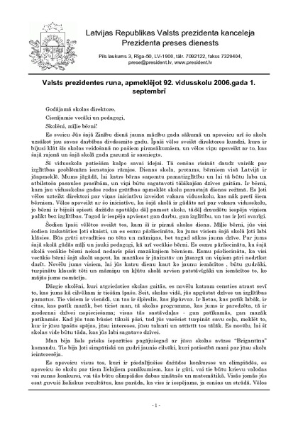 Valsts prezidentes runa, apmeklējot 92. vidusskolu 2006.gada 1. septembrī