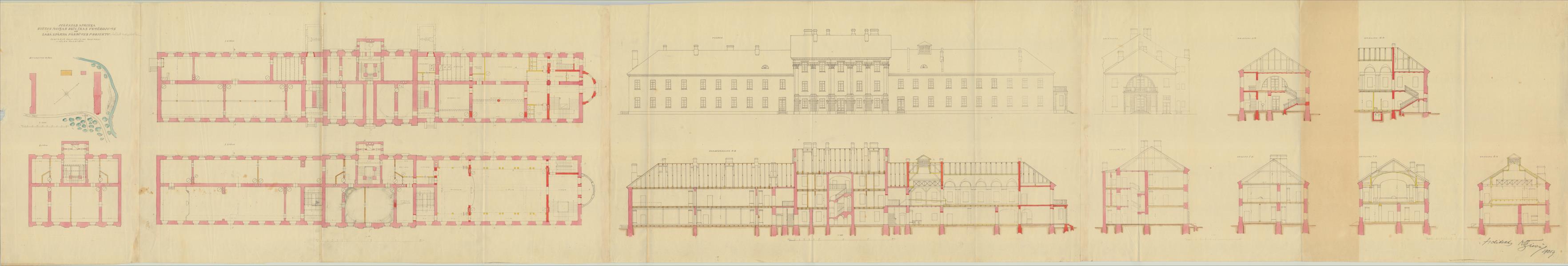 Svētes muižas pils. 1. stāvs, 2. stāvs, 3. stāvs, situācijas plāns, fasādes (Jelgavas novads, Svētes pagasts. Svēte. Lielsvētes iela 18 k-1.)