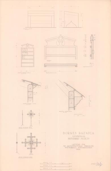 Latvijas etnogrāfiskais brīvdabas muzejs celtņu komplekss. Bornes baznīca, altāra soliņš, jumts, krusts, tāfele ( Rīga. Bonaventuras iela 10.)