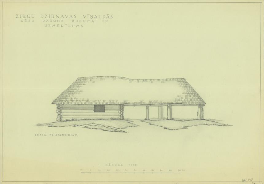 Latvijas etnogrāfiskais brīvdabas muzejs celtņu komplekss. Zirgu dzirnavas no Stalbes pagasta "Vīņaudos". Fasādes ( Rīga. Bonaventuras iela 10.)