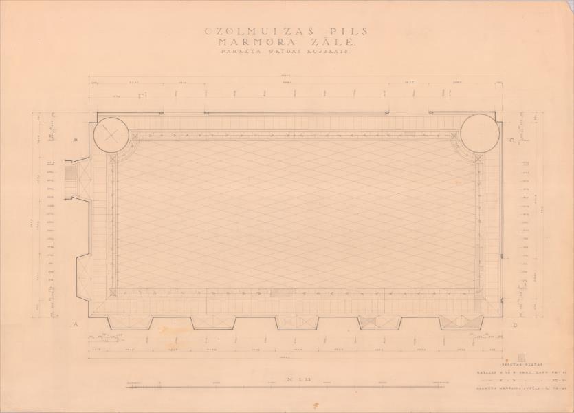 Ozolmuižas pils. Marmora zāle. Parketa grīda (Alojas novads, Brīvzemnieku pagasts. Ozolmuiža. Ozolmuižas pils.)
