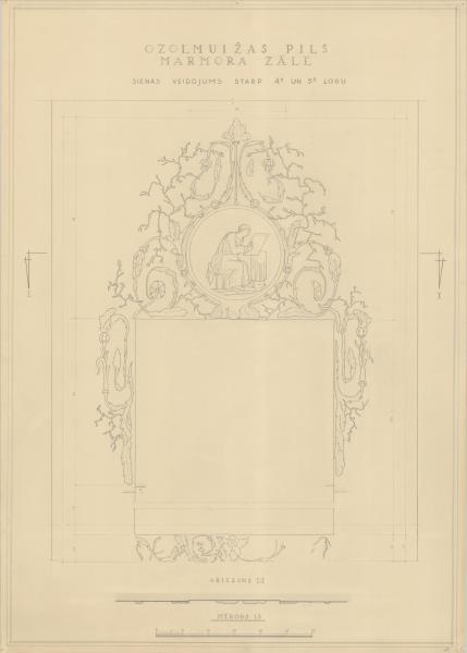 Ozolmuižas pils. Marmora zāle. Sienas veidojums starp 4. un 5. logu (Alojas novads, Brīvzemnieku pagasts. Ozolmuiža. Ozolmuižas pils.)