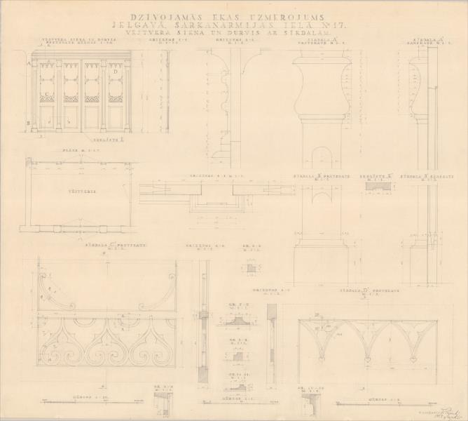 Dzīvojamā ēka. Vējtvera siena, durvis ar detaļām ( Jelgava. Dambja iela 17.)
