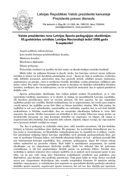 Valsts prezidentes runa Latvijas Sporta pedagoģijas akadēmijas 85.gadskārtas svinībās Latvijas Nacionālajā teātrī 2006.gada 6.septembrī