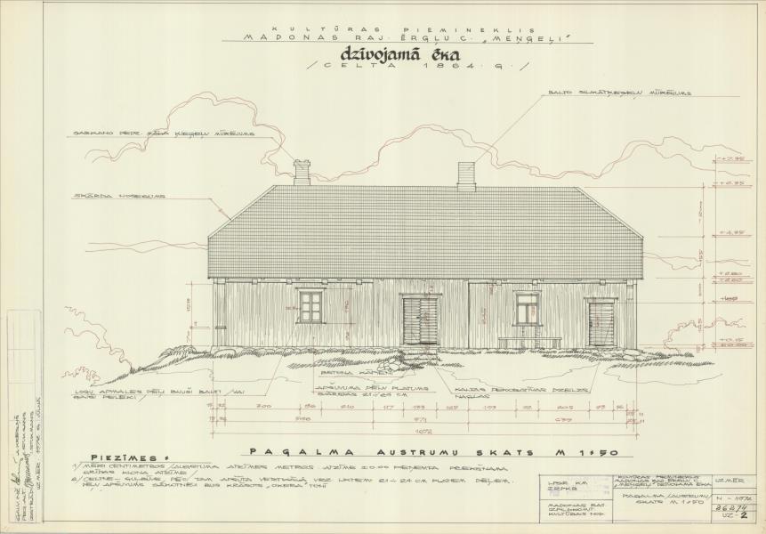Mūzikas darbinieku brāļu Jurjānu dzimtās mājas. Dzīvojamā ēka. Pagalma (austrumu) skats (Ērgļu novads, Ērgļu pagasts. Meņģeļi.)