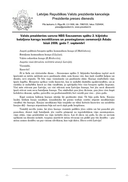Valsts prezidentes uzruna NBS Sauszemes spēku 2. kājnieku bataljona karoga iesvētīšanas un pasniegšanas ceremonijā Ādažu bāzē 2006. gada 7. septembrī