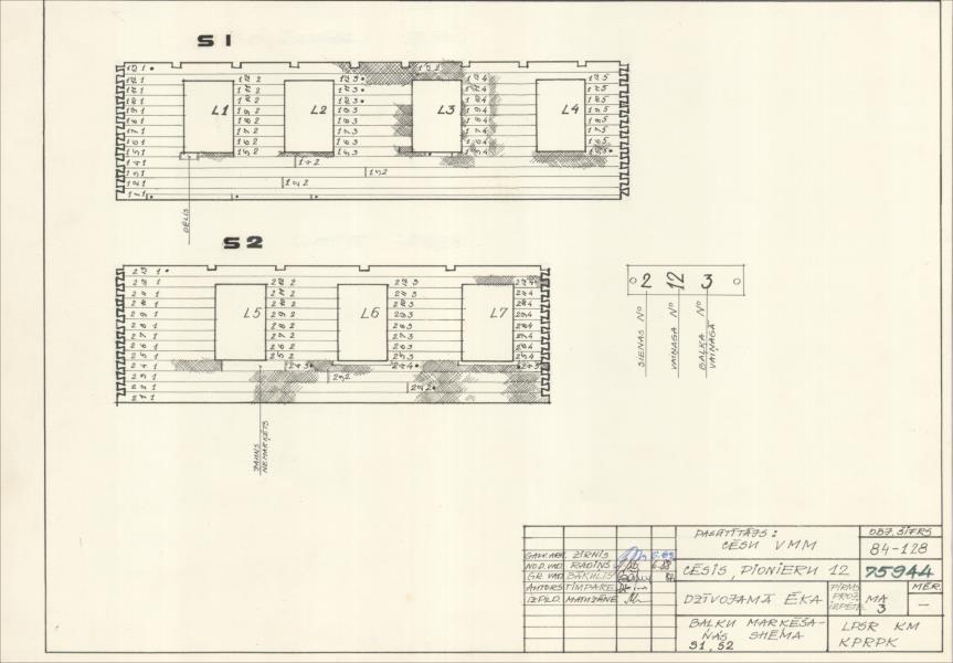 Dzīvojamā ēka. Baļķu marķēšanas shēma S1, S2 (Cēsu novads, Cēsis. Mazā Katrīnas iela 12.)
