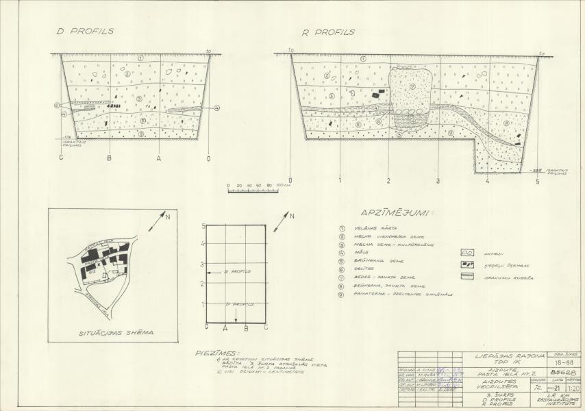 Aizputes vecpilsēta. 3. šurfs, dienvidu un rietumu profili, situācijas shēma (Aizputes novads, Aizpute. Pasta iela 2.)