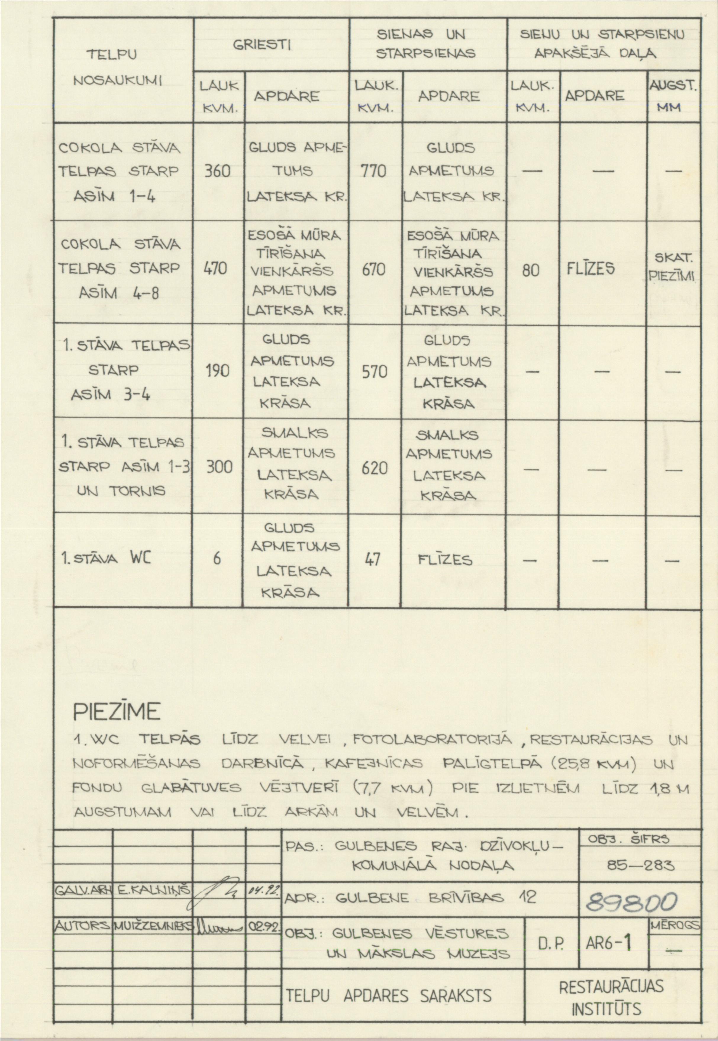 Baltā pils, Vecgulbenes muižā. Telpu apdares saraksts (Gulbenes novads, Gulbene. Brīvības iela 12.)