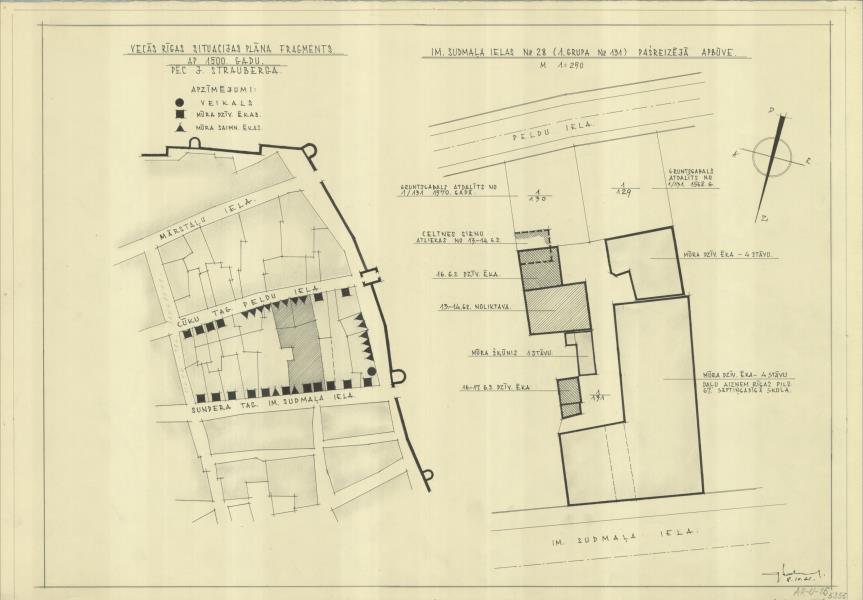 Dzīvojamās ēkas un noliktavu komplekss. Situācijas plāna fragments ap 1500.g., 1961.g. apbūve ( Rīga. Grēcinieku iela 28.)