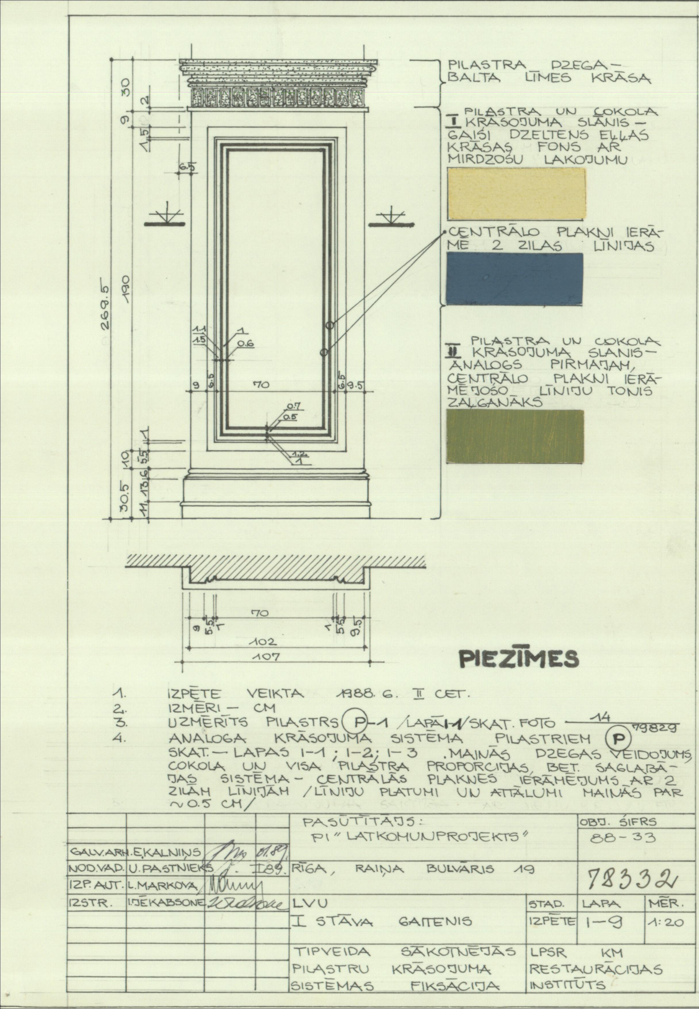 Rīgas Politehniskā institūta galvenā ēka, tagad Latvijas Universitāte. Tipveida sākotnējās pilastru krāsojuma sistēmas fiksācija. 1. stāva gaitenis ( Rīga. Raiņa bulvāris 19.)