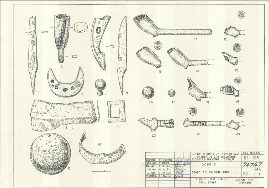 Dobeles pilsdrupas. 1. un 2. izrakumu laukums. Senlietas (Dobeles novads, Dobele. Brīvības iela 2c.)