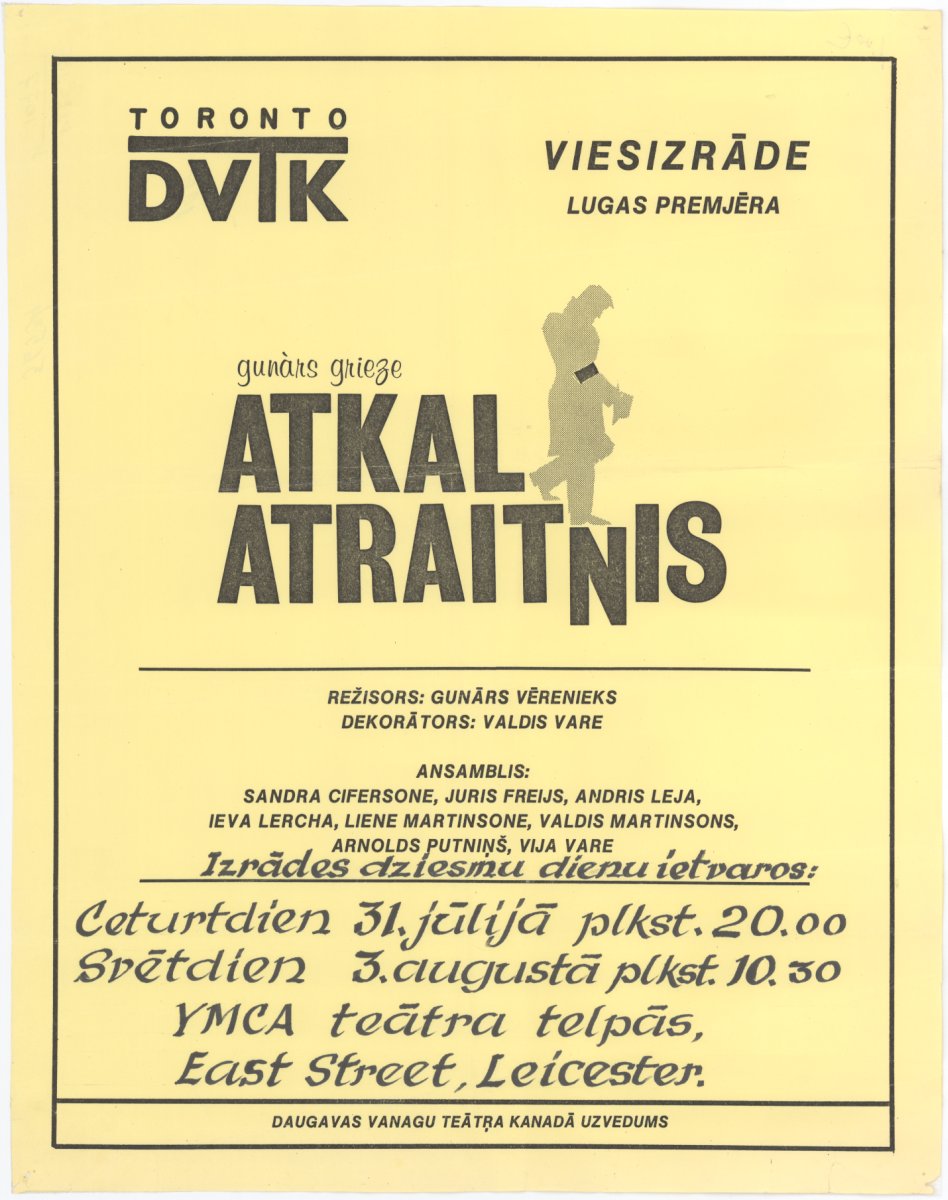 Gunārs Grieze Atkal atraitnis. Režisors Gunārs Vēvernieks, dekorators Valdis Vare. [attēls] Izrādes dziesmu dienu ietvaros ceturtdien, 31. jūlijā plkst. 20.00, svētdien, 3. augustā plkst. 10.30 YMCA Teātra telpās, East Street, Leicester / mākslinieks nezināms