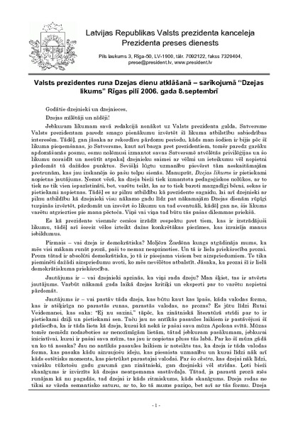 Valsts prezidentes runa Dzejas dienu atklāšanā – sarīkojumā “Dzejas likums” Rīgas pilī 2006. gada 8.septembrī
