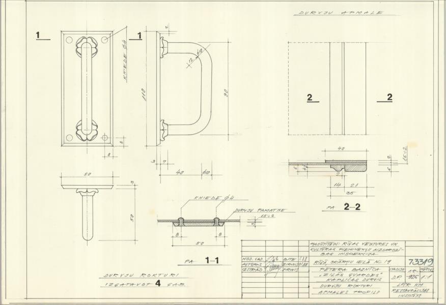 Sv. Pētera luterāņu baznīca. Zilās gvardes kapličas durvis, durvju rokturi, apmales profils ( Rīga. Reformācijas laukums 1.)