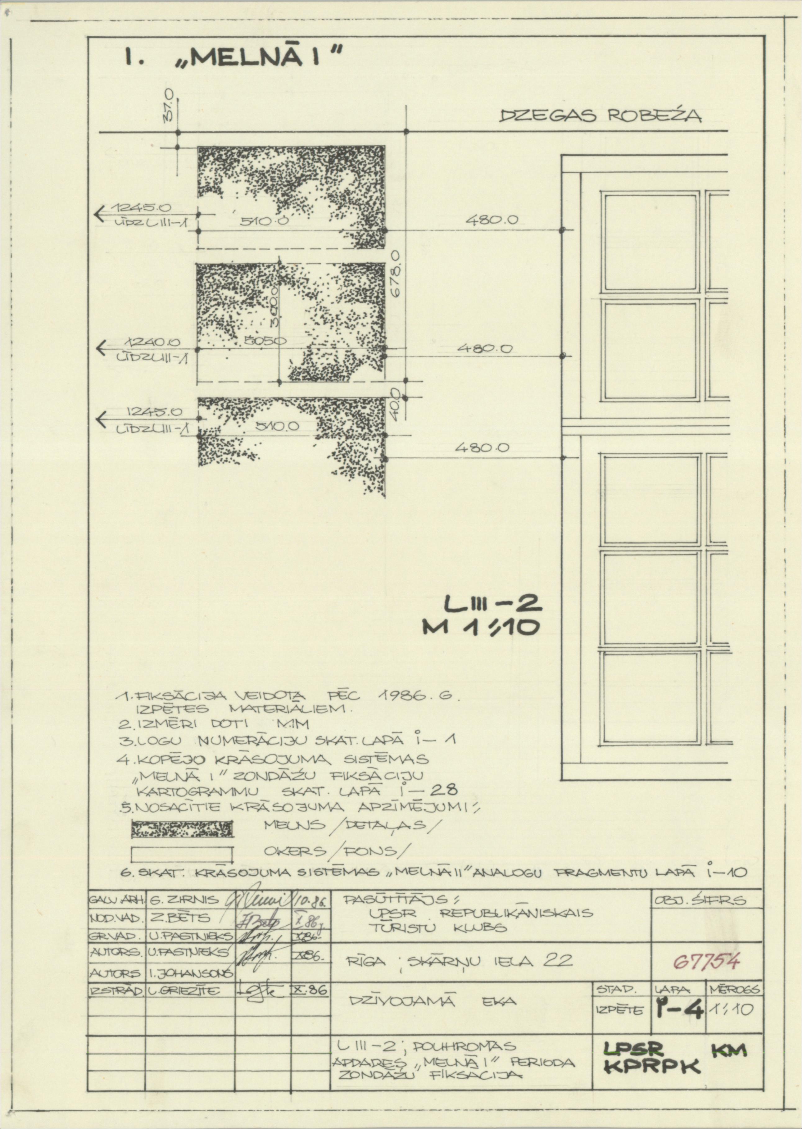 Ekes konvents. Loga polihromās apdares "melnā I" perioda zondāžu fiksācija. Dzegas robeža ( Rīga. Skārņu iela 22.)