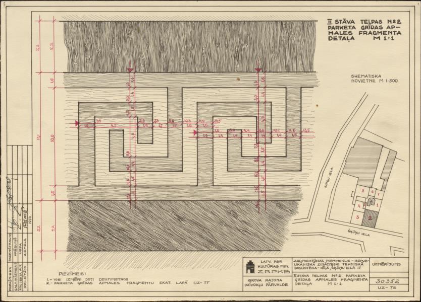 Dzīvojamā ēka. 2. stāva telpas parketa grīdas apmales fragmenta detaļa ( Rīga. Šķūņu iela 17.)