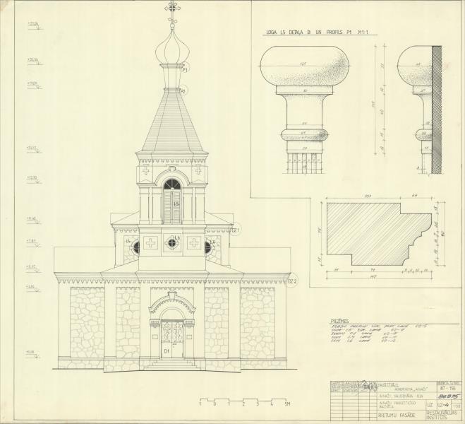 Ainažu pareizticīgo baznīca. Rietumu fasāde, loga L-5 detaļa B un profils P1 (Salacgrīvas novads, Ainaži. Valdemāra iela 63.)