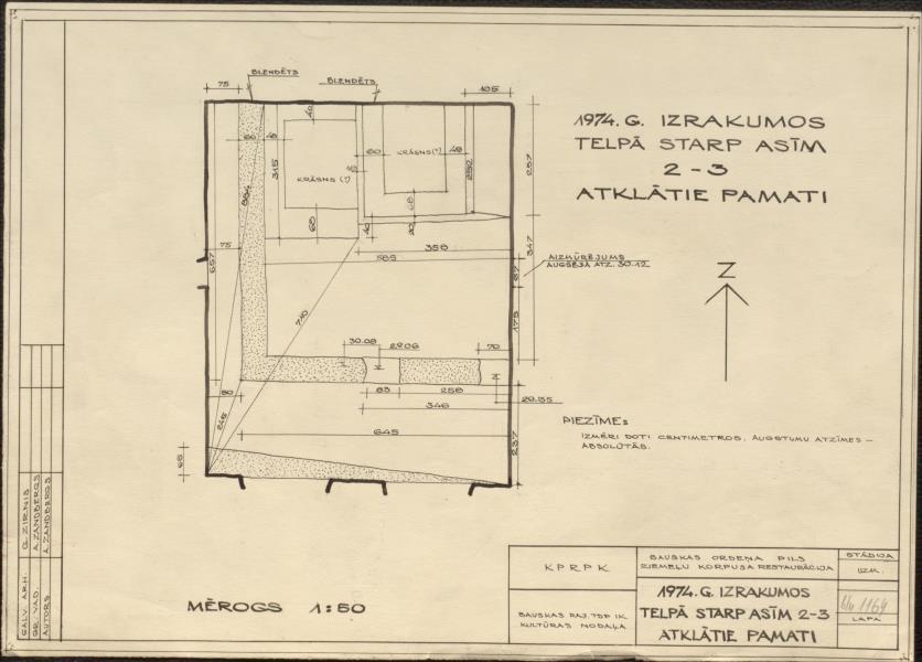 Bauskas pilsdrupas. 1974. gada izrakumos telpā starp asīm 2 - 3 atklātie pamati (Bauskas novads, Bauska. Pilskalns.)