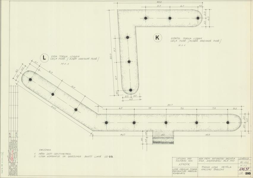 Biķeru luterāņu baznīca. Torņa loga metāla kalumu šabloni ( Rīga. Vecā Biķernieku iela 59.)