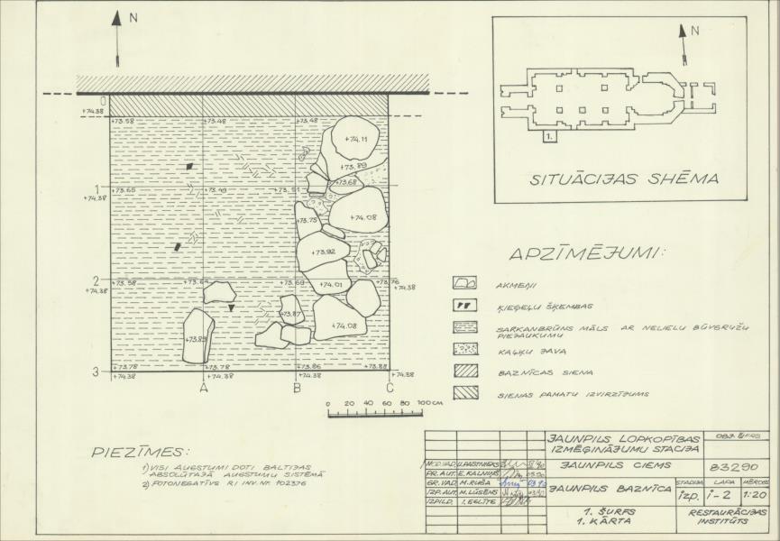 Jaunpils luterāņu baznīca. 1. šurfs 1. kārta, situācijas shēma (Jaunpils novads, Jaunpils pagasts. Jaunpils. Jaunpils baznīca.)