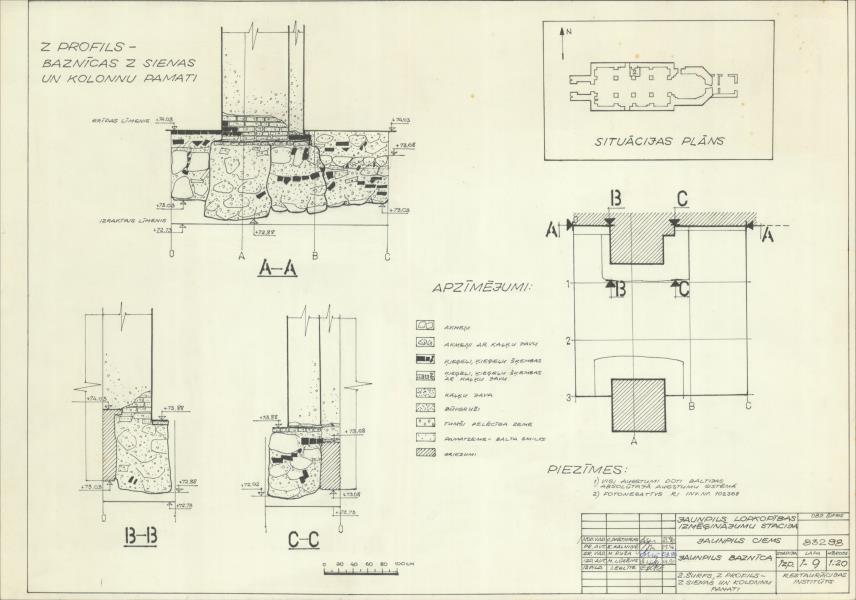 Jaunpils luterāņu baznīca. 2. šurfs, ziemeļu profils – ziemeļu sienas un kolonnu pamati (Jaunpils novads, Jaunpils pagasts. Jaunpils. Jaunpils baznīca.)