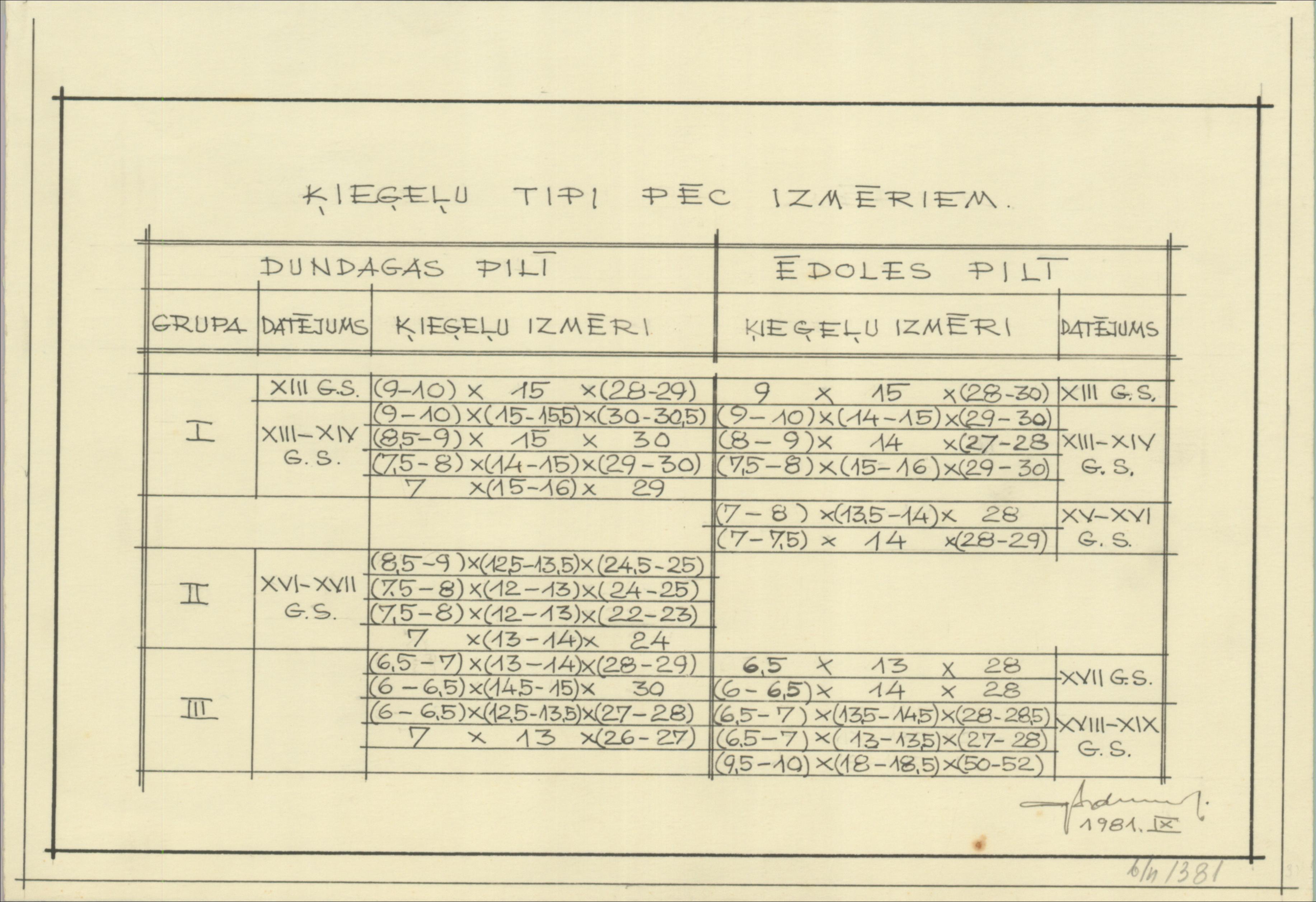 Ēdoles pils. Ķieģeļu tipi pēc izmēriem (Kuldīgas novads, Ēdoles pagasts. Ēdole. Ēdoles pils.)