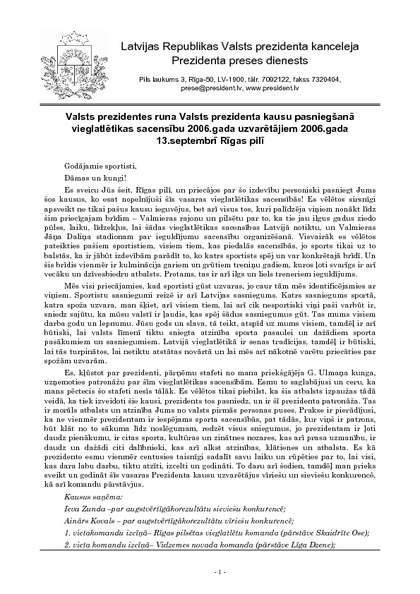 Valsts prezidentes runa Valsts prezidenta kausu pasniegšanā vieglatlētikas sacensību 2006.gada uzvarētājiem 2006.gada 13.septembrī Rīgas pilī