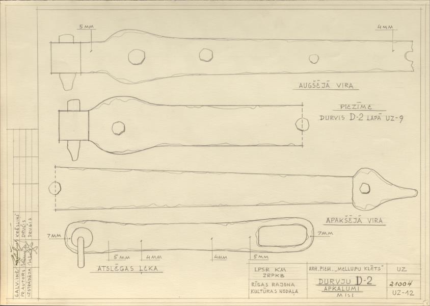 Doles muižas apbūve. Mellupu klēts, durvju D-2 apkalumi (augšējā vira, apakšējā vira) (Salaspils novads, Salaspils pagasts. Daugavas muzejs.)